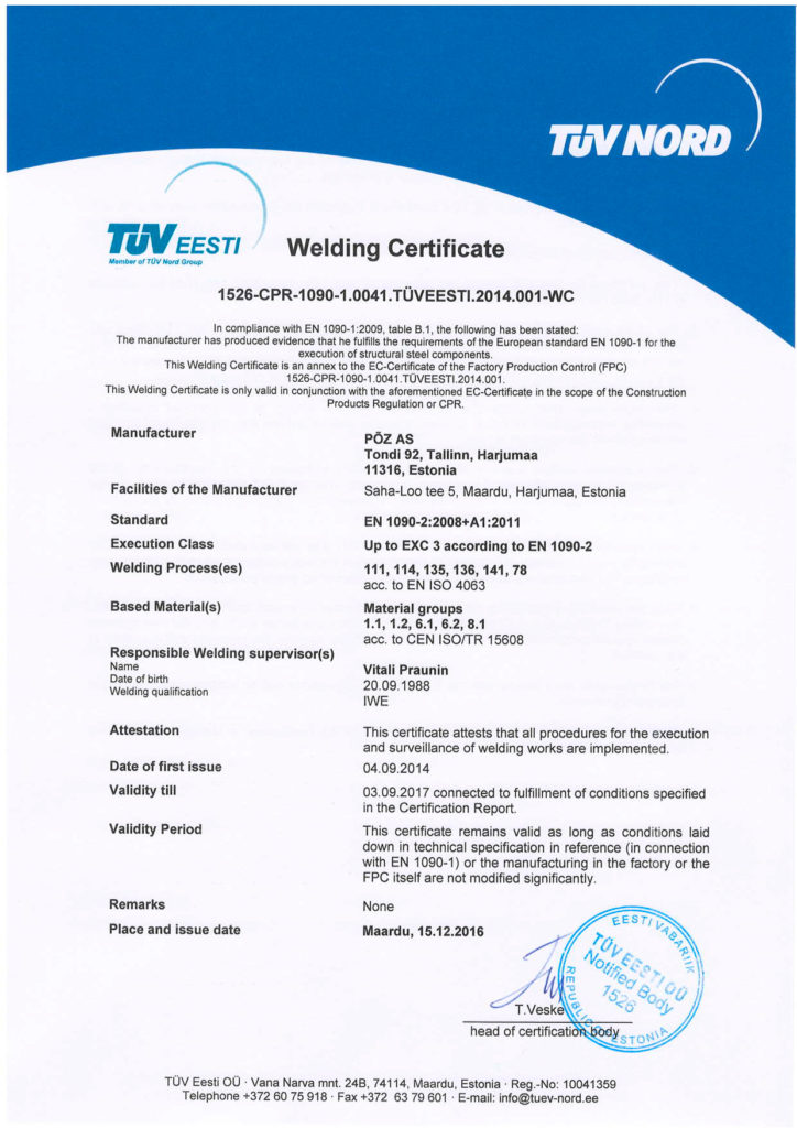 - Teraskonstruktsioonide valmistamine vastaval standardile EN 1090-2 kuni EXC3 teostusklassini.