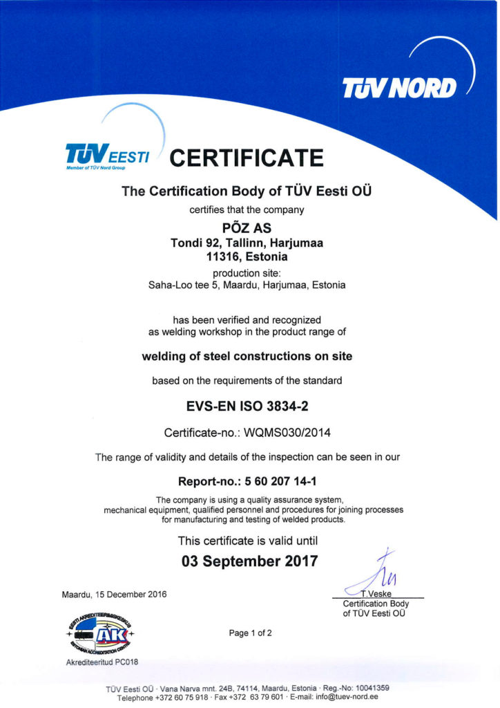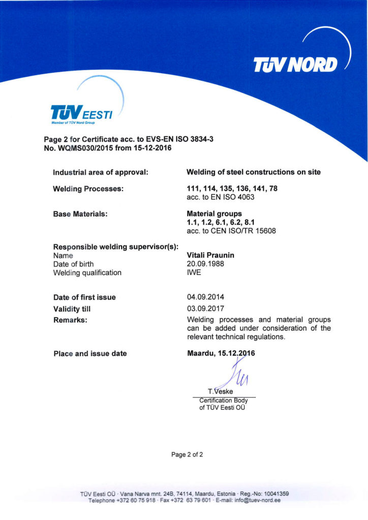 - Keevituse kvaliteedinõuded vastavalt ISO 3834-2.